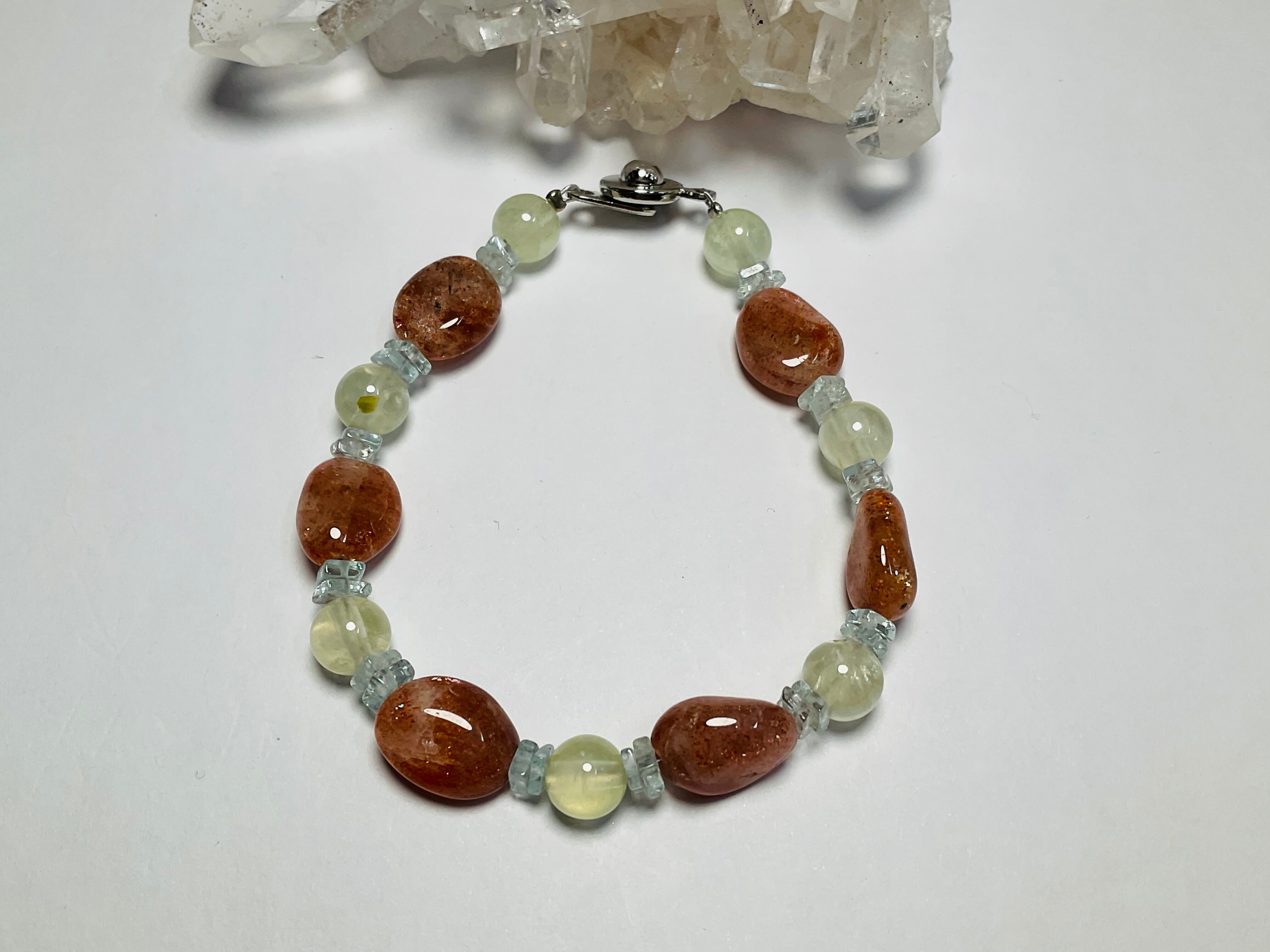 サンストーン、プレナイト、アクアマリンのブレスレットが
